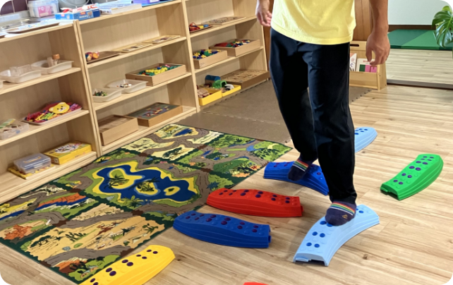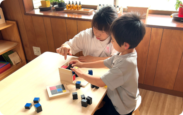 考え抜かれたモンテッソーリ教具を使って、子どもは自分で五感(視覚、聴覚、触覚、味覚、嗅覚)を働かせ遊びます。子どもの自主性「やってみたい」を引き出し、成功体験「できた」「楽しい」に繋げていきます。